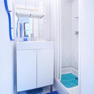 Une salle de bain (douche et évier)